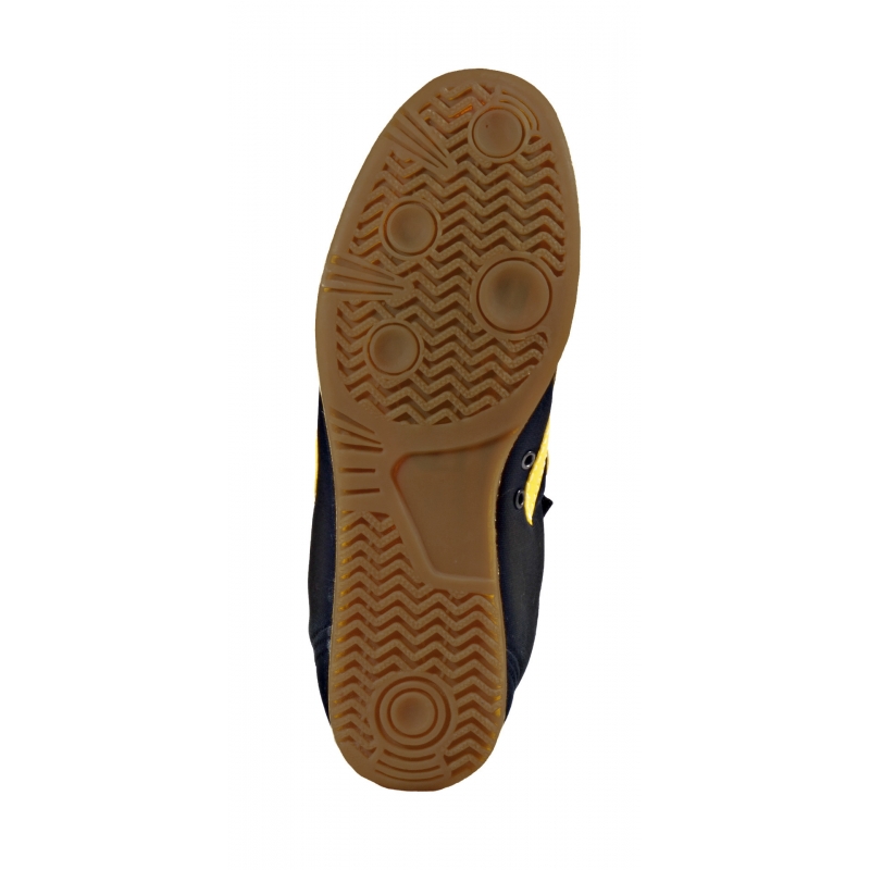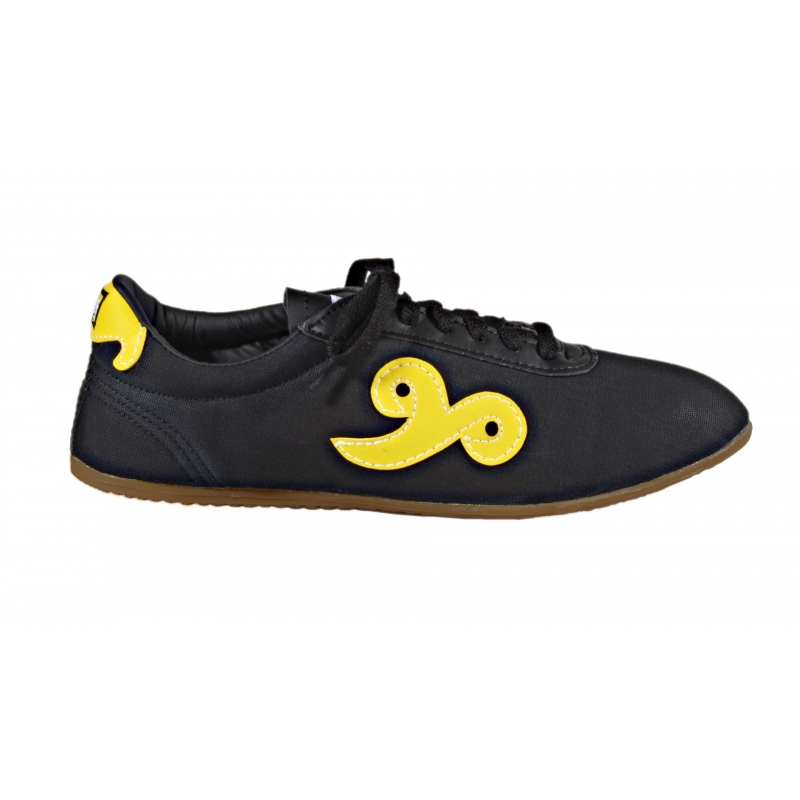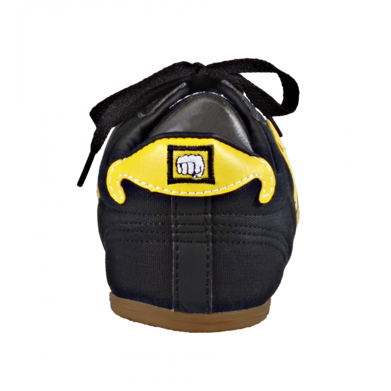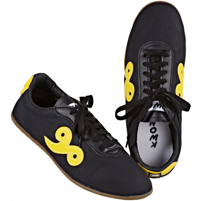 Originální čínské Kung-fu boty ze severní Číny. Jsou vyrobeny z velmi odolného, lehce lesklého nylonového materiálu se žlutou Kung-fu podrážkou a s čínskými, žlutými, designovými nášivkami po stranách a na patě boty. Dobrý poměr mezi kvalitou a cenou.