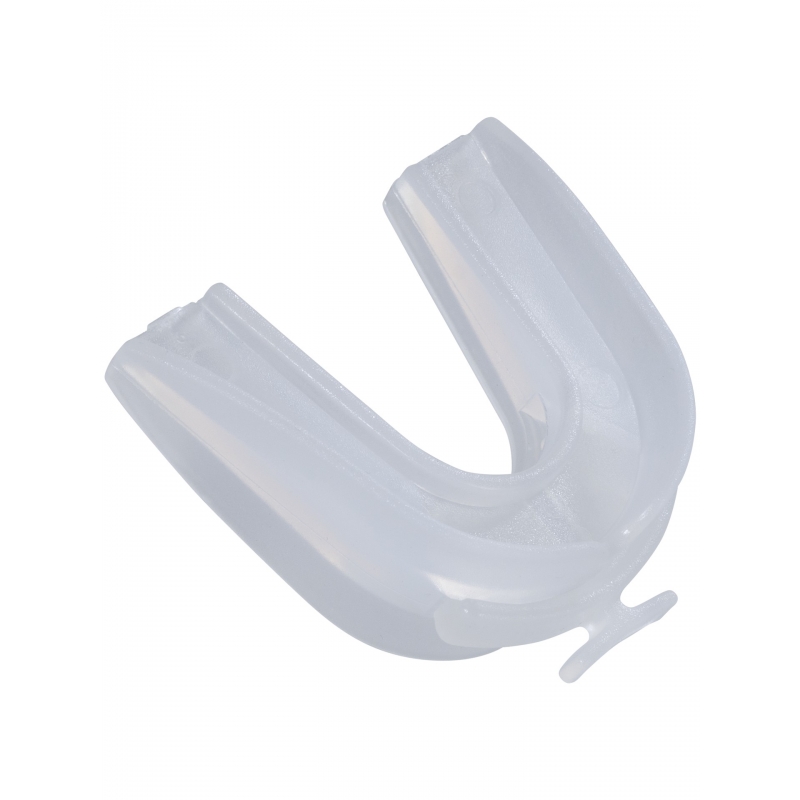 Průhledný chránič na zuby pro horní a dolní čelist. Chránič má integrovaný dýchací otvor.