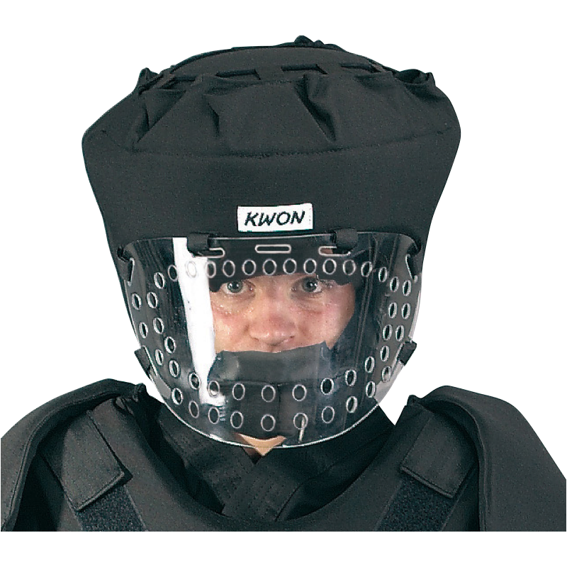 Chránič hlavy je nastavitelný v horní a zadní části helmy. Oblast okolo očí je chráněna nerozbitným plexi sklem. Je určena na trénink s měkkou tyčí KWON. Doporučujeme zkombinovat s oblekem PLUS.