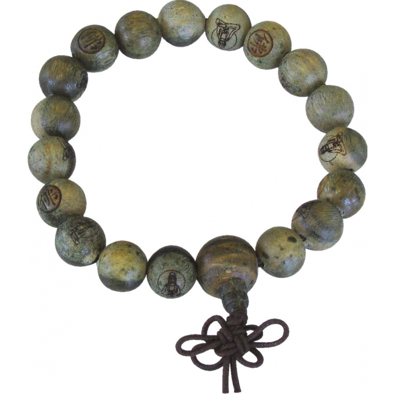 Tento dřevěný, korálkový náramek, s vyraženými chraktery na všech korálcích, je originální náramek přímo ze Shaolinu, který nosí mniši a studenti. Je známý jako korálky Buddhy nebo růženec, tento náramek je používaný při modlení, meditaci, pro štěstí a požehnání. Je to nejběžnější doplněk pro všechny praktikující Shaolin. Náramek je lehce ovoněný a představuje nekonečný uzel.