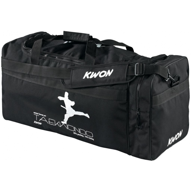 Velká taška KWON s motivem taekwonda v černé barvě má popruh přes rameno a dvě boční kapsy na zip. Tato taška je velmi prostorná - je ideální volbou na závody či soustředění.