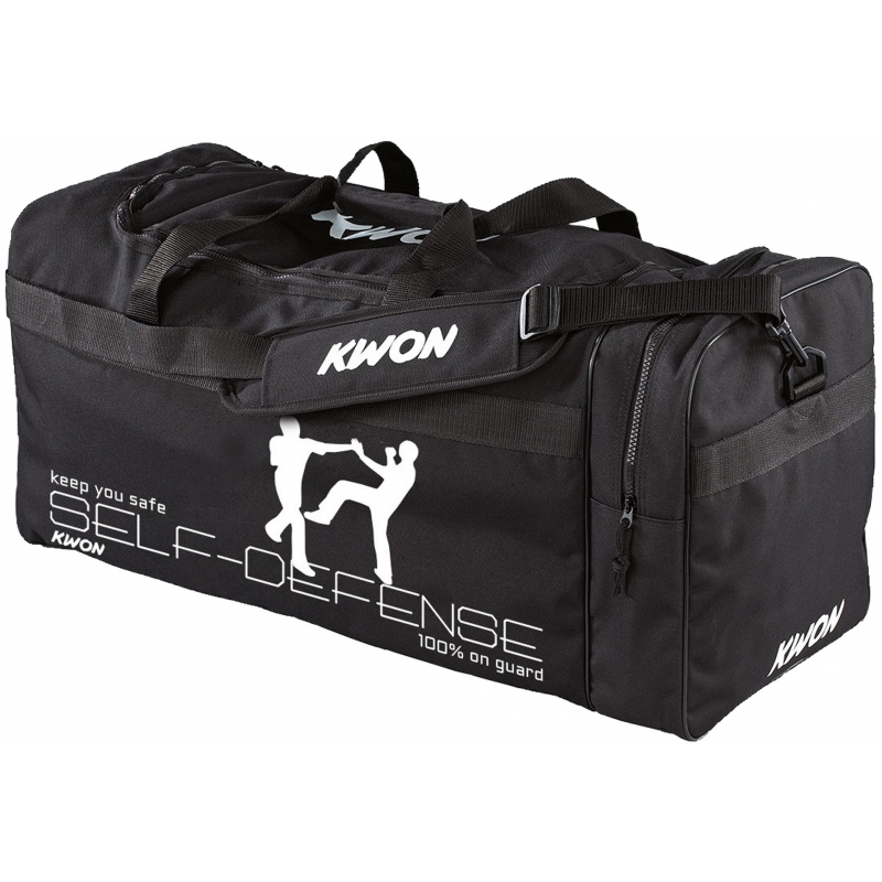 Velká taška KWON s motivem sebeobrany v černé barvě má popruh přes rameno a dvě boční kapsy na zip. Tato taška je velmi prostorná - je ideální volbou na závody či soustředění.
