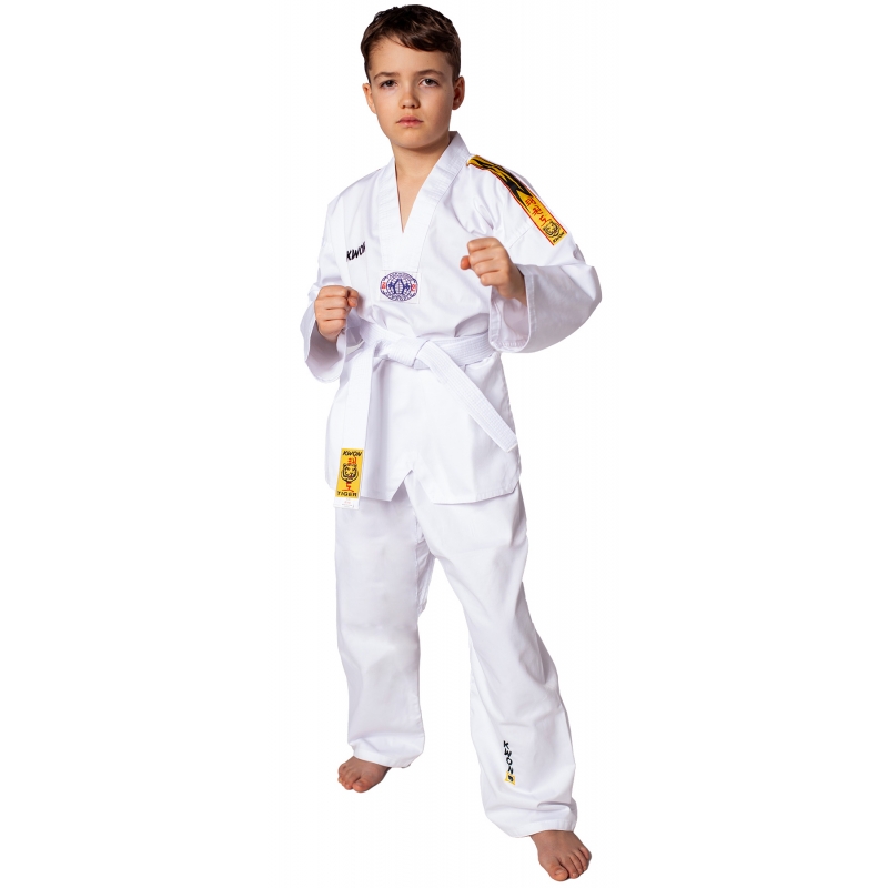Dobok na taekwondo KWON Tiger je dobok určený pro juniory. Je vyroben ze 35% bavlny a 65% polyesteru. Dobok je dodáván společně s bílým páskem.