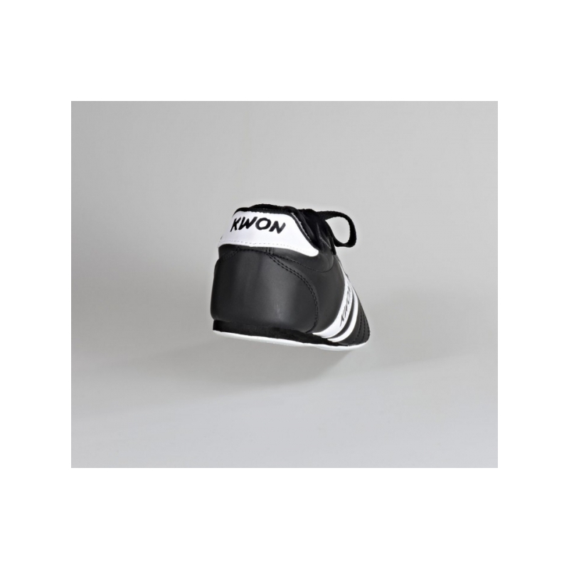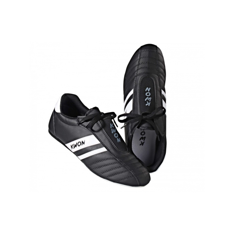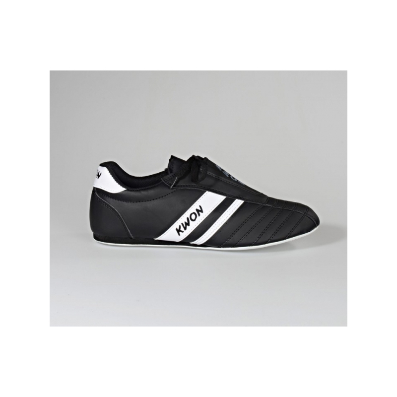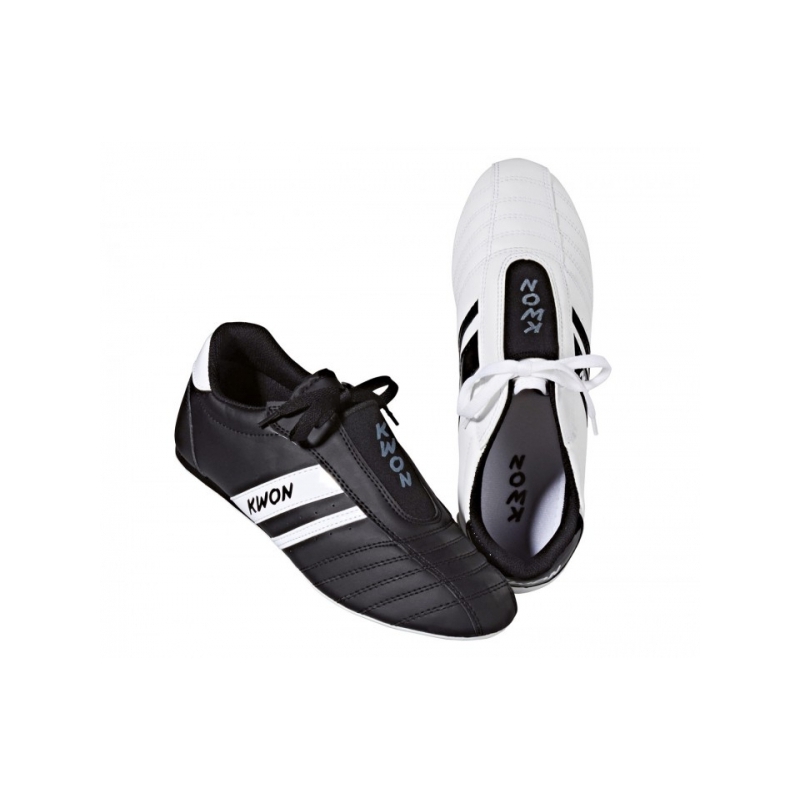 Lehké, ale odolné KWON sálovky pro začátečníky. Mají tenkou, ale pružnou gumovou podrážku se zvýšenou patou a ventilační průduchy. Boty jsou dvojitě prošité a mají decentní pruhy s nápisem KWON. Logo KWON je také na nártu boty. Boty jsou vyrobené z umělé kůže.