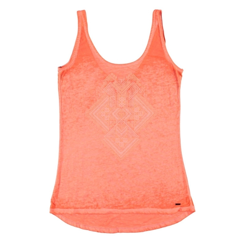 Dámská top Bagaglio je volnějšího střihu, které patří do letní kolekce Brunotti. Top je vyroben z pohodlného vypalovaného žerzeje, což je poloprůsvitná látka, vyrobená z několika surových materiálů. Jeden z těchto materiálů je částečně odstraněn rozpouštědlem a tímto procesem je na látce dosaženo krajkového efektu. Top je na přední straně opatřen stylovým vzorem.